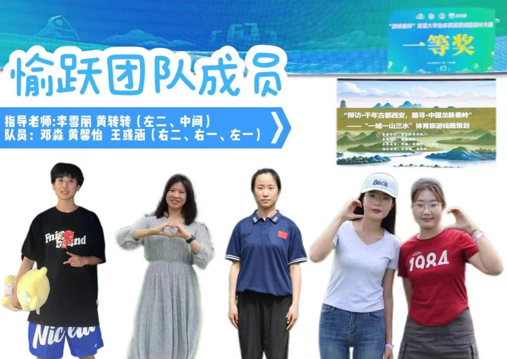 自收到参赛通知以来,我校参赛团队积极筹备,在李雪丽、黄转转两位老师的指导下,邓淼、黄馨怡、王彧涵三位队员以“探访·千年古都西安,踏寻·中国龙脉秦岭”为主题,设计了“一城一山三水”的体育旅游路线,以文化、旅游、体育等为融合点,凭借新颖的设计荣获全国一等奖。