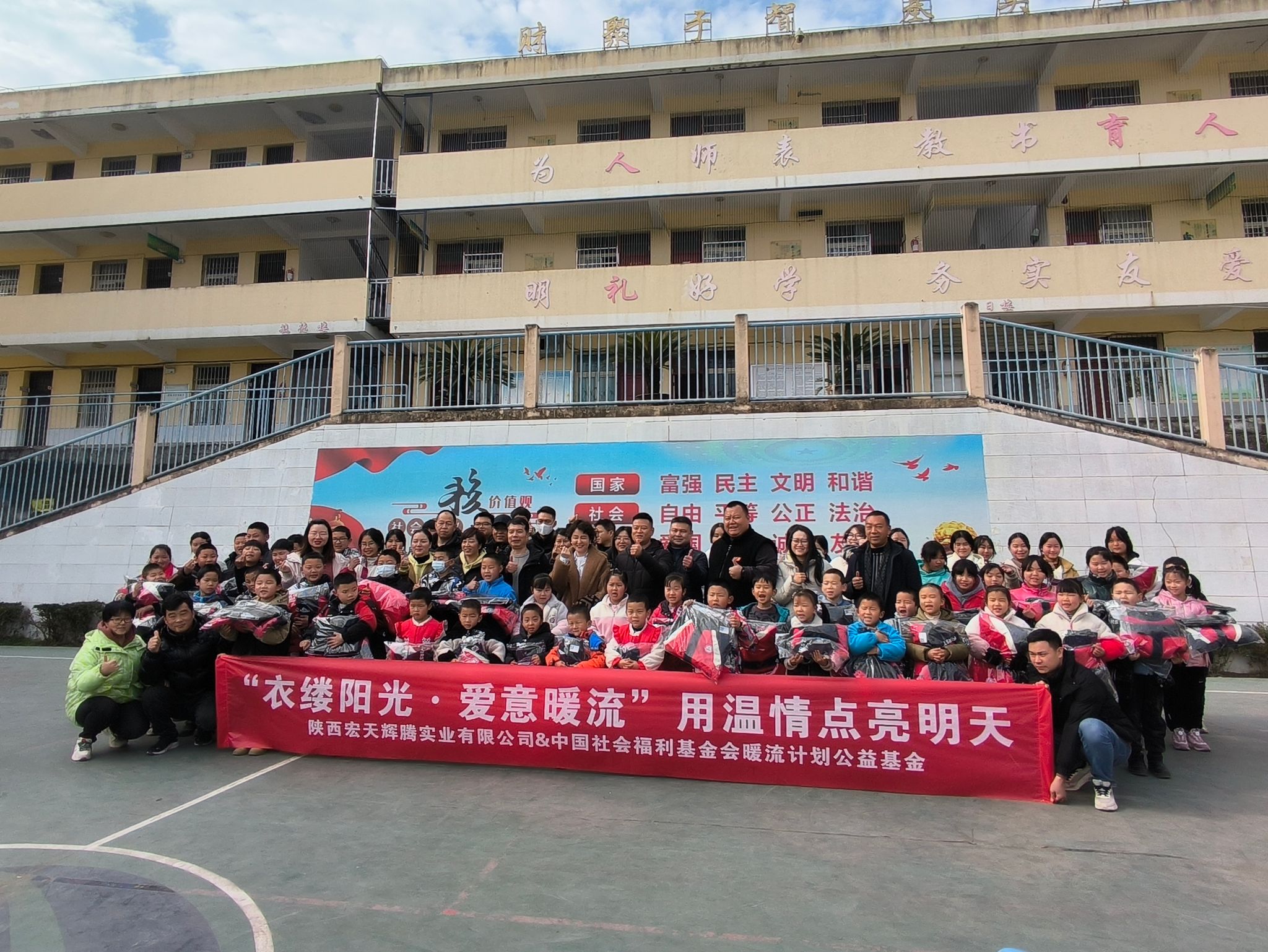 本网讯 为了让孩子们温暖过冬,安心学习,1月17日,我校乡村振兴驻村工作队携手中国社会福利基金会暖流计划公益基金东航驿站,在县河镇财梁九年制学校举行了冬装校服套装捐赠仪式。县河镇副镇长杨涛、组织委员王亚琪,我校乡村振兴驻村工作队、中国福利基金会工作人员及学校全体师生参加。